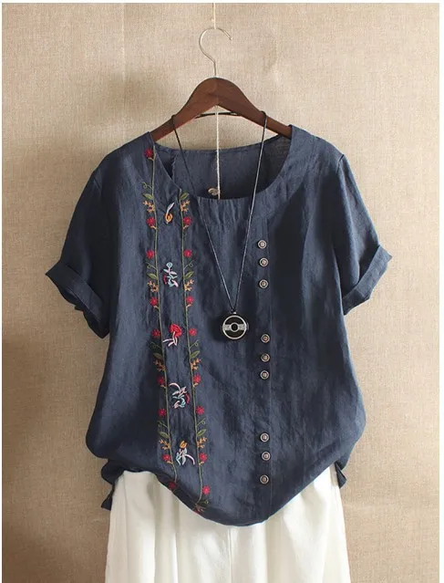 Women’s Round Neck Cotton Shirt Artistic Style Commuting Tops