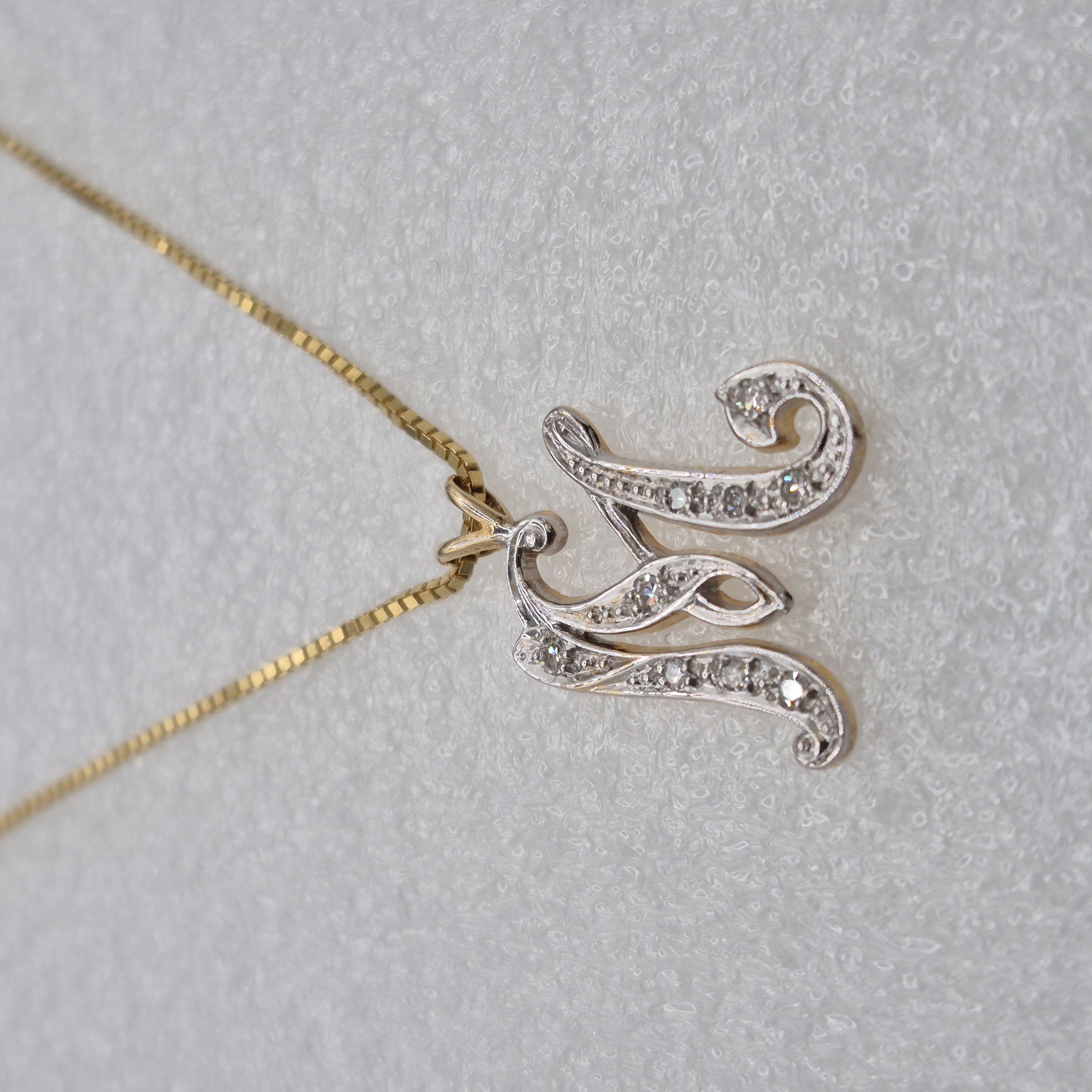 14kt Gold Lady’s Initial “M” Diamond Pendant on a 16″ Box Chain